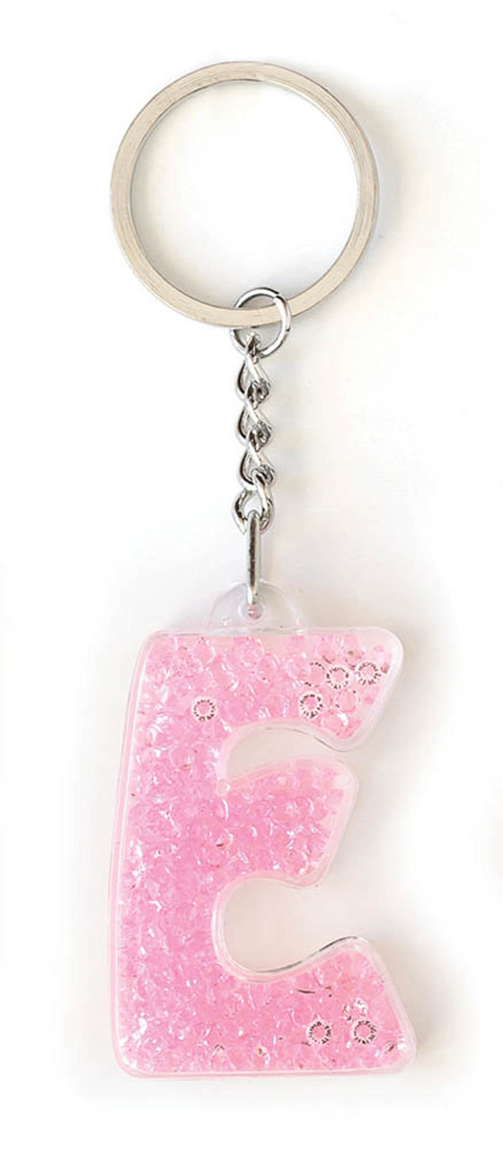 Брелок буква "Е", рожева. Аксесуар використовується в декоративних цілях. Об'ємний, наповнений блискучими паєтками. Стильно виглядає на сумках, рюкзаках і т. д. Матеріал: акрил, метал. Розмір: висота - 5 см, ширина - від 2,5 до 4,5 см